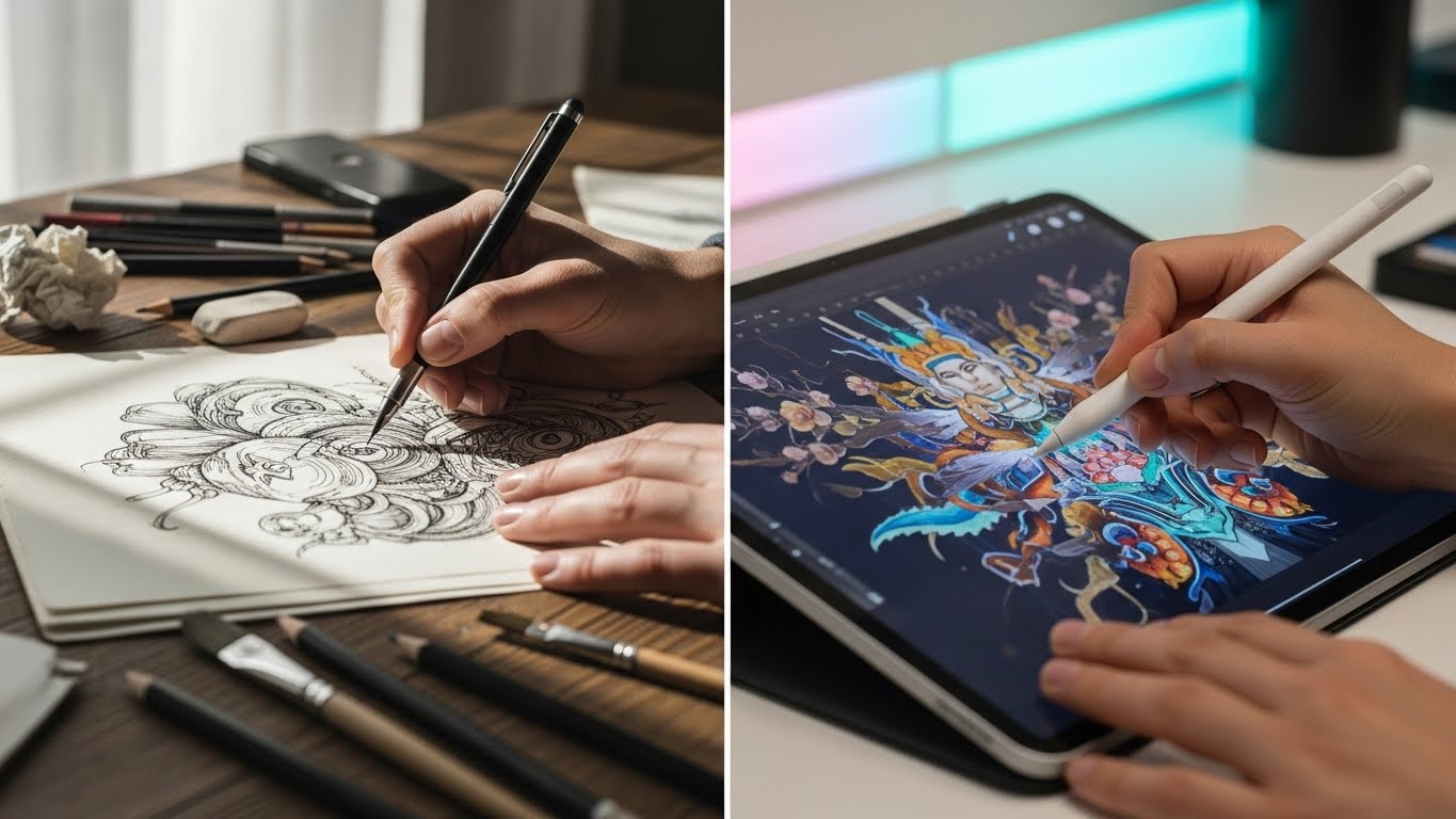 Durante séculos, a arte nasceu do contato direto entre a mão, o papel e o material. Lápis, tinta, carvão, pincel. O gesto era definitivo. Cada erro deixava uma marca. Cada acerto carregava intenção.